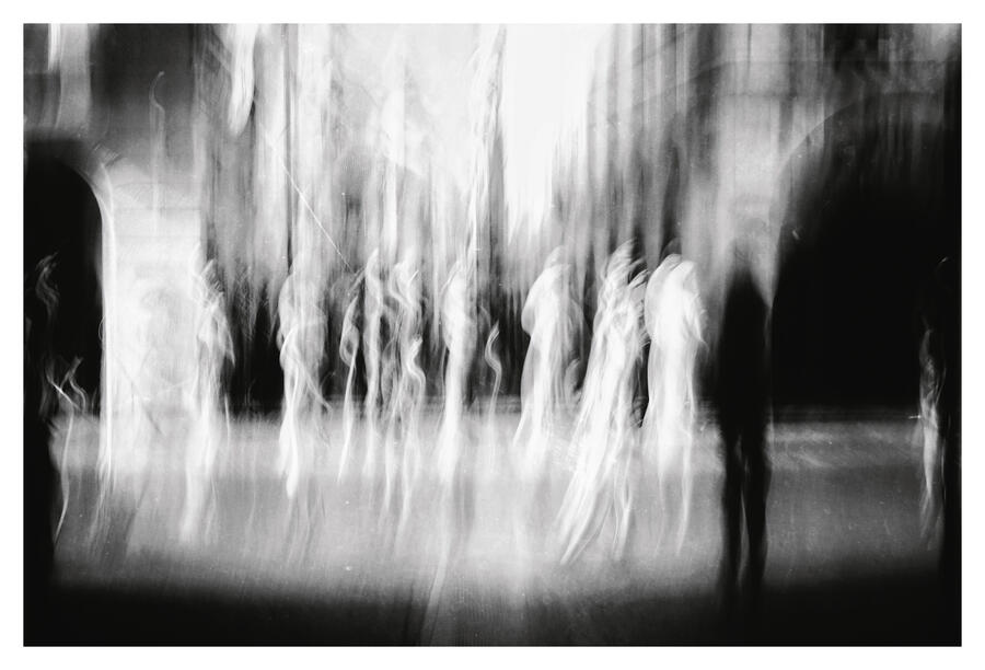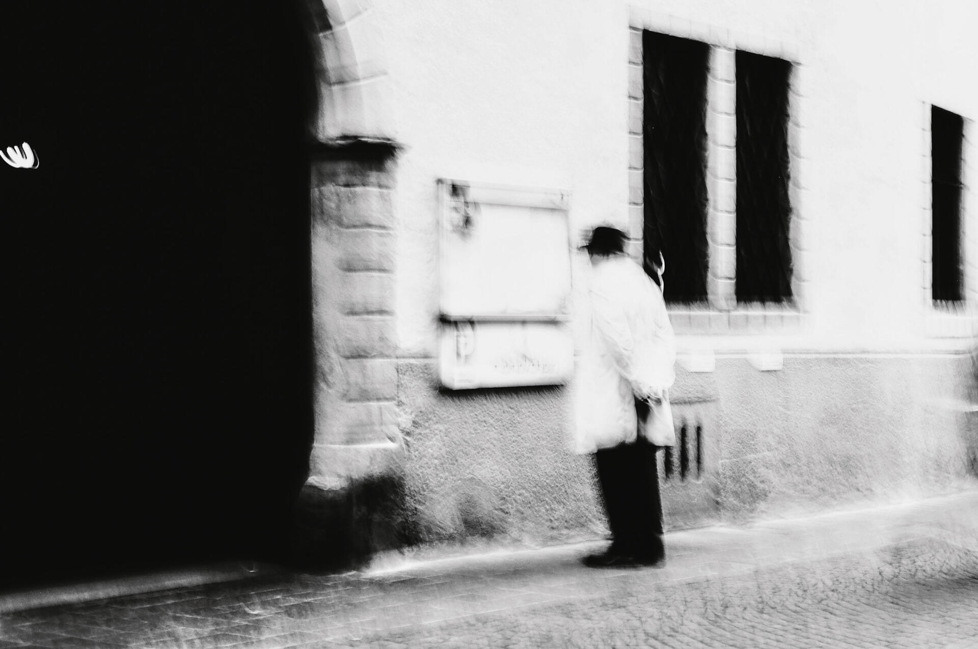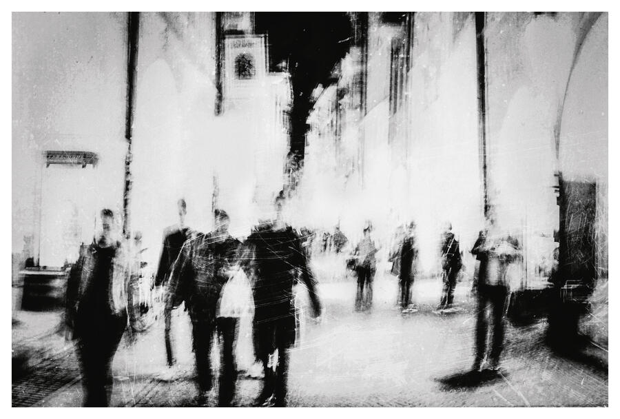 DIE ÜBERGANGEs gibt eine Kreuzung in Meran, an der die Zeit keinen festen Halt hat. Wo vier Straßen sich treffen, aber das, was sie verbinden, ist nicht immer klar.Ich stand im Schatten und beobachtete das Licht vor mir. Und dann kamen sie. Zehn Gestalten in Weiß, die lautlos von links nach rechts glitten, mitten im Übergang. Nicht gehend. Nicht eilig. Einfach... bewegend.Ihre Umrisse streckten sich zum Himmel, so sanft wie ein Atemzug, so hell wie Erinnerung. Sie waren nicht allein. Rechts von ihnen, eine Gestalt in Schwarz, verankert, klein, still wartend. Auf das Signal? Auf die Erlaubnis? Oder einfach nur, um den anderen beim Fortgehen zuzusehen?Manche Leute sagen, ICM ist nur Unschärfe, aber Unschärfe ist, was passiert, wenn die Realität zu voll wird, um ihre Form zu halten.