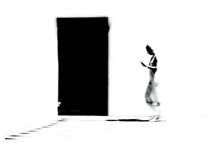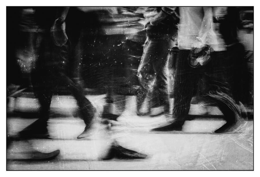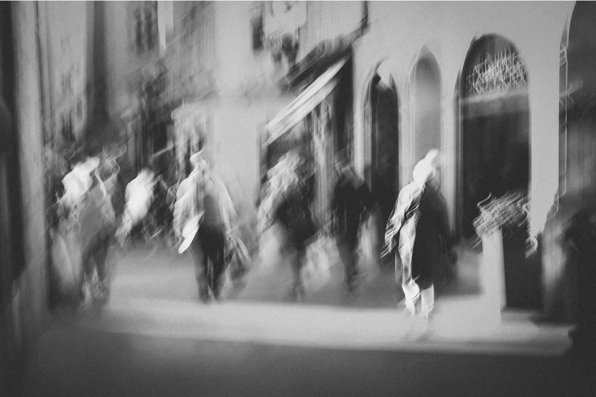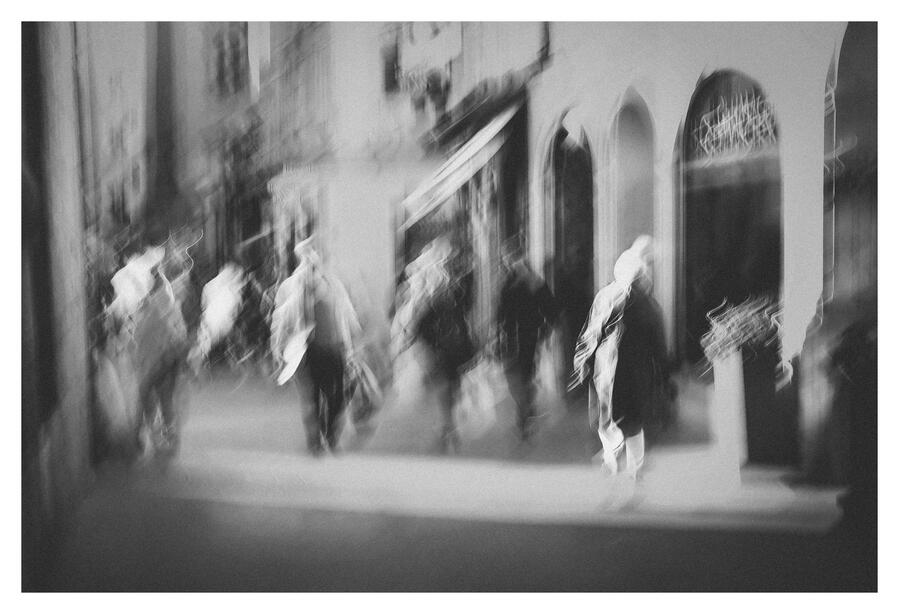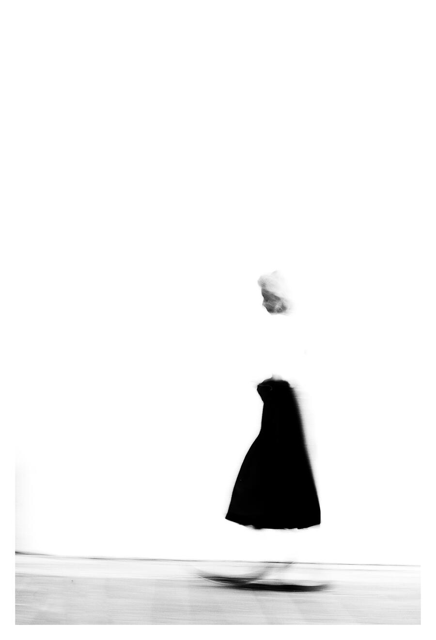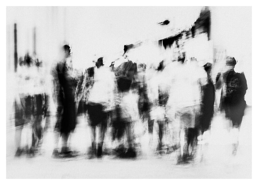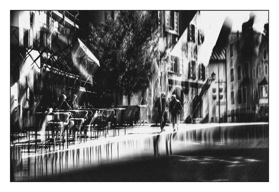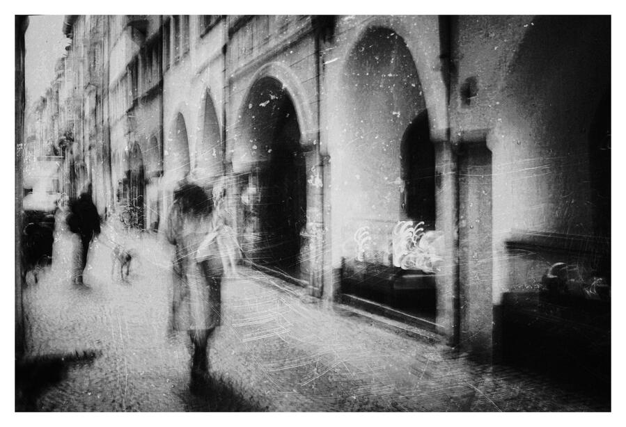 DIE ÜBERGANGEs gibt eine Kreuzung in Meran, an der die Zeit keinen festen Halt hat. Wo vier Straßen sich treffen, aber das, was sie verbinden, ist nicht immer klar.Ich stand im Schatten und beobachtete das Licht vor mir. Und dann kamen sie. Zehn Gestalten in Weiß, die lautlos von links nach rechts glitten, mitten im Übergang. Nicht gehend. Nicht eilig. Einfach... bewegend.Ihre Umrisse streckten sich zum Himmel, so sanft wie ein Atemzug, so hell wie Erinnerung. Sie waren nicht allein. Rechts von ihnen, eine Gestalt in Schwarz, verankert, klein, still wartend. Auf das Signal? Auf die Erlaubnis? Oder einfach nur, um den anderen beim Fortgehen zuzusehen?Manche Leute sagen, ICM ist nur Unschärfe, aber Unschärfe ist, was passiert, wenn die Realität zu voll wird, um ihre Form zu halten.