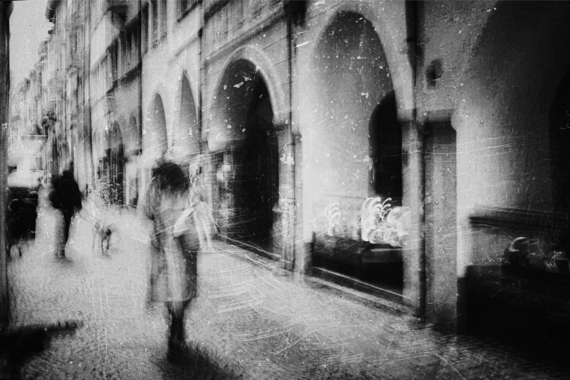 DIE VERLORENEN GÄSTEDiese Gasse war nicht auf der Karte. Sie auch nicht, sie waren Gäste der Gespenster-Tour von gestern Abend, machten einen falschen Abzweig durch einen Lichtstrahl und landeten hier, in diesem Zwischenraum. Ein Tunnel, der leise summt und schwach nach Lavendel und alten Geheimnissen riecht.Ich kam nur, um die Schatten zu fotografieren. Aber jetzt schauen sie mich an, als hätten sie auf mich gewartet. Und ehrlich gesagt… das Licht ist irgendwie perfekt.Vorsicht, was du verwischst. Es gibt Orte, die kannst du nicht mehr entsehen.